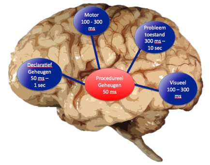 Figuur 1: De hersenkeuken In figuur 1 is de hersenkeuken te zien die ik vandaag wil bespreken. In het midden is het procedurele geheugen, onze chef-kok, met daarom heen een aantal andere hersenstations. Het interessante is dat we het complete tijdcontinuüm van multitasking kunnen verklaren door naar conflicten in de verschillende hersengebieden te kijken. De chef-kok van de hersenen kan in korte tijd opdrachten aan alle stations geven, de groentesnijder van de hersenen is misschien een paar honderd milliseconden bezig, maar soms moeten taken enkele seconden in de oven van de hersenen staan. Procedureel geheugen: de motor van de hersenenHet procedurele geheugen is de snelste component, omdat het elke 50 ms een actie kan uitvoeren. Hoewel figuur 1 suggereert dat procedureel geheugen de centrale flessenhals in het systeem is, is dit in praktijk zelden het geval vanwege de hoge snelheid: het procedurele geheugen kan twintig acties per seconde uitvoeren. Alleen zeer precieze experimenten kunnen conflicten in dit systeem aan het licht brengen. Een voorbeeld van zo'n taak is een zogenaamd perfect time-sharing experiment, zoals dat gedaan is door Schumacher en collega's8. In dit experiment moeten proefpersonen twee taken doen. Op hetzelfde moment wordt een toon en een plaatje aangeboden. Op het plaatje moet gereageerd worden met een toetsaanslag, en op de toon door het zeggen van een woord. Beide taken zijn heel eenvoudig, en kunnen na een aantal dagen training binnen 300 ms worden uitgevoerd. Als proefpersonen deze twee taken tegelijk moeten uitvoeren, zijn ze na voldoende training nauwelijks langzamer dan wanneer de taken apart moeten worden gedaan. Dus als het zeggen van het woord alleen gedaan moet worden gaat dit maar 14 ms sneller dan wanneer het samen met de andere taak gedaan moet worden. In ons model verklaren wij dit met twee threads of draden, voor elke taak één6. Omdat de taak zo goed geoefend is, is het model van elke individuele taak heel eenvoudig: voor de visuele taak wordt het beeld herkend, bepaalt het procedurele geheugen welke toets daarbij hoort en voert het motor gebied de toetsaanslag uit. Op vergelijkbare wijze herkent het auditieve systeem de toonhoogte, bepaalt het procedurele geheugen het bijbehorende woord, en initieert het vocale gebied het uitspreken van het woord. De draden kunnen in de knoop raken in het procedurele geheugen, omdat dit voor beide taken op ongeveer hetzelfde moment nodig is. Dit betekent dat één van de taken moet wachten. Omdat het procedurele geheugen zo snel is, is deze wachttijd maximaal 50 ms, maar gemiddeld in de orde van de 14 ms die in het experiment gevonden zijn. De usual suspects: perceptie en motoriek