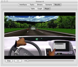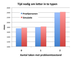 Figuur 2. Voorbeeld van Distract-R Een tweede categorie van hersengebieden betreft perceptueel en motorische gebieden, die gekoppeld zijn aan de zintuigen en de spieren. Acties in deze gebieden duren ongeveer 100 ms tot 300 ms. Het onderzoek op dit terrein is het meest vergevorderd, met als gevolg dat, zoals ik al in mijn inleiding aangaf, velen denken dat deze gebieden, of preciezer de zintuigen en spieren die ermee verbonden zijn, de enige zijn die ertoe doen. Ons threaded cognition onderzoek heeft geleid tot het bouwen van een simulatieprogramma, distract-R, dat voorspellingen doet over de gevolgen van een extra taak tijdens het autorijden5. In figuur 2 is een simulatie te zien van wat er gebeurt als we tijdens het rijden een woord proberen in te typen op de navigatiecomputer. De interferentie wordt hier bijna helemaal veroorzaakt doordat de gesimuleerde bestuurder niet naar de weg kijkt tijdens het typen. Simulaties als deze zijn heel nuttig, omdat er snel meerdere varianten van de navigatiecomputer kunnen worden uitgetest onder verschillende omstandigheden, zoals snelheid, rijden in de mist of in het donker, maar ook de lengte van het woord dat moeten worden ingetypt. Lange-termijn geheugenOp ongeveer dezelfde tijdsschaal als perceptie en motoriek bevindt zich het lange-termijn geheugen, of meer precies het declaratieve geheugen. Dit gebied opereert in de orde van 50 ms tot ongeveer 1 seconde. Declaratief geheugen heeft vele functies, en kan daarom om meerdere redenen tot multitaskvertraging leiden. Declaratief geheugen is nodig voor het interpreteren en produceren van taal, het oplossen van rekensommen en allerlei andere zaken waarbij feitenkennis nodig is. Met name ook belangrijk voor multitasking is de rol van declaratief geheugen in vaardigheden. Een kenmerk van beginnergedrag, of het nu autorijden, pianospelen, of het spreken van een nieuwe taal is, is dat het nagenoeg onmogelijk is om er iets anders naast te doen. Onze verklaring is dat voor nieuwe vaardigheden veelvuldig het declaratieve geheugen geraadpleegd moet worden. Het is alsof de kok in de keuken voor elke handeling een kookboek moet raadplegen. In ons eerdergenoemde experiment van Schumacher, waarin op een toon en een plaatje gereageerd moest worden, waren proefpersonen in het begin helemaal niet zo snel, en waren ze veel langzamer als ze twee dingen tegelijk moesten doen. De verklaring hiervoor is dat ze het declaratieve geheugen voor beide taken nodig hebben om te weten welke toets bij welk plaatje hoort, en welk woord bij welke toon. Hierdoor is het gebied waar beide draden elkaar kruisen veel groter, en leidt daardoor tot vertragingen van honderden in plaats van tientallen milliseconden. Een leerproces zet deze kookboekraadpleging langzaam om in procedurele kennis, waardoor de interferentie langzaam verdwijnt. Dit is niet alleen in het eenvoudige Schumacher experiment te zien, maar ook in een klassiek experiment waarin proefpersonen gedicteerde woorden moesten opschrijven terwijl ze verhalen aan het lezen waren, en in experimenten waarin proefpersonen moesten leren om de boordcomputer van een Boeing 777 te programmeren9. De probleemtoestand, een nieuwe kijk op werkgeheugenDan kom ik nu bij de laatste van de gebieden, en misschien wel het meest interessante. Waar de hersengebieden tot nu toe redelijk overeenstemden met algemeen geaccepteerde psychologische functies, wijkt het volgende hier van af. Wij hebben het de probleemtoestand genoemd, en het komt overeen met een deel wat normaal gesproken werkgeheugen wordt genoemd. De probleemtoestand wordt gebruikt om informatie actief te houden die nodig is voor het uitvoeren van de huidige taak. Als we bijvoorbeeld naar de bijkeuken lopen om daar een schroevendraaier te pakken, dan slaan we "schroevendraaier" op in onze probleemtoestand. Als we vervolgens in de bijkeuken vergeten zijn wat we nodig hadden komt dat omdat we intussen aan iets anders gedacht hebben, waardoor de schroevendraaier verdrongen is. Daarnaast wordt de probleemtoestand gebruikt voor het opslaan van tussenresultaten bij redeneringen die uit meerdere stappen bestaan.
