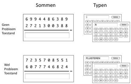 Figuur 3. Design van het experiment van Borst, Taatgen & van Rijn3. De capaciteit van de probleemtoestand is zeer klein, en beperkt zich tot één informatie-element, anders dan het klassieke werkgeheugen waarvan de omvang op zeven plus of min twee wordt gesteld. Als we nu meerdere taken tegelijk willen doen die tussenresultaten moeten bijhouden, dan ontstaat er een conflict dat op een tijdschaal van meerdere seconden ligt. Dit is wellicht het beste te illustreren aan de hand van een experiment uit het onderzoek van Jelmer Borst, Hedderik van Rijn en mijzelf3. In dit experiment moesten proefpersonen twee taken doen: het maken van aftreksommen en het intypen van een serie letters. Deze twee taken werden afgewisseld: een kolom in de som oplossen, dan een letter intypen, dan weer een kolom oplossen. Van elke van de twee taken waren er twee varianten, een makkelijke en een moeilijke, waarbij de makkelijke zonder en de moeilijke met probleemtoestand gedaan werd (figuur 3). Dit was als volgt uitgevoerd: bij makkelijke aftreksommen hoefde nooit geleend te worden, en was het mogelijk naar de volgende kolom te gaan zonder iets van de vorige kolom te weten. Bij moeilijke sommen daartegen moest er soms wel geleend worden, en was het dus nodig om tussen de kolommen te onthouden of er al dan niet geleend was. Bij het intypen van de letters was in de makkelijke variant telkens te zien wat de volgende letter was die moest worden ingetypt. In de moeilijke versie werd aan het begin een heel woord getoond, dat letter voor letter moest worden ingetypt zonder dat er iets op het scherm te zien was. Bij deze variant moest dus onthouden worden wat het woord was, en hoeveel van het woord al getypt was.