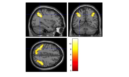 Figuur 5. Hersenactiviteit die correspondeert met het gebruik van de probleemtoestand Dit levert voor de probleemtoestand het plaatje in figuur 5 op. De gele gebieden vormen dat deel van de hersenen waarin de activiteit het beste overeenstemt met de voorspelde activiteit in de probleemtoestand. Deze gebieden in de parietale cortex van de hersenen zijn al eerder in onderzoek van Anderson geïdentificeerd als een waarschijnlijke locatie van de probleemtoestand1. Met dit neuroimaging-onderzoek vallen alle puzzelstukjes op zijn plaats: de theorie voorspelt het, een gedragsexperiment en een cognitief model ondersteunen het, en een neuroimaging-experiment bevestigt het. Ons experiment bestaat uit typische laboratoriumtaken, maar heeft een aantal belangrijke consequenties. Het laat namelijk zien dat betrekkelijk kleine variaties in taken tot grote gevolgen kunnen leiden. In het verkeer kan een situatie waarin geen probleemtoestand nodig is, zoals het rijden op een rustige overzichtelijke weg, plotseling veranderen in een situatie waarin wel een probleemtoestand nodig is, bijvoorbeeld bij het naderen van een onoverzichtelijke kruising. Stel dus dat we in een veilige situatie aan het autorijden zijn. Aangezien de situatie overzichtelijk is, is hierbij geen probleemtoestand nodig. In zo'n situatie kan het dan aantrekkelijk zijn om naast het rijden te internetten, waarvoor de probleemtoestand wel nodig is. Als de verkeersituatie nu plotseling complex wordt, dan ontstaat er een conflict dat er eerder niet was. Als het tijdkritische beoordelen van een verkeerssituatie dan aan het kortste eind trekt is er een sterk vergrote kans op een ongeluk. Dit is een dynamische situatie die niet noodzakelijk aan het licht komt in experimenten die hier geen rekening mee houden. De probleemtoestand speelt ook een belangrijke rol voor de kantoorwerker, want als hij of zij een taak uitvoert waarbij een beperkte probleemtoestand moet worden bijgehouden, ik denk bij mijzelf bijvoorbeeld aan het nakijken van tentamens, dan zullen de kosten van interrupties, zoals een telefoongesprek, niet heel groot zijn. Als een probleemtoestand over een langere periode moet worden opgebouwd, zoals bij het lezen of schrijven van een artikel, dan zijn interrupties wel heel kostbaar, omdat na de interruptie de probleemtoestand gereconstrueerd moet worden. Multitasking is overalHoewel in onze rondleiding door de hersenen de voorbeelden betrekking hadden op problemen rond multitasken, zijn de conflicten eerder uitzondering dan regel. In het laatste deel wil ik daarom ingaan op de positieve kanten van het multitaskingtalent van de hersenen. Toen ik elf jaar geleden in deze zaal stond, verdedigde ik de stelling dat intelligentie zonder leren geen intelligentie is. Vandaag wil ik hier nog iets aan toevoegen: intelligentie zonder multitasking is geen intelligentie. Menselijk bewustzijn is niet zo serieel als wij denken. Als u op dit moment nog steeds naar mij luistert en niet probeert de muurschildering achter mij te begrijpen, dan bent u ook aan het multitasken. U bent bezig met het vinden van grammaticale structuur in de woorden die ik uitspreek, en hier betekenis aan toe te kennen. Maar ook moet deze betekenis aan een representatie van wat ik tot nu toe heb gezegd gekoppeld worden, en misschien bent u al een mening aan het vormen of ik al dan niet gelijk heb. Momenteel ben ik alleen aan het woord, en heeft u alleen de draden nodig om wat ik zeg te begrijpen. Als ik echter met u in gesprek zou zijn, zou u ook nog bezig zijn met nadenken over wat voor antwoord u wilt geven, en op zoek zijn naar een gaatje in mijn woordenstroom om het initiatief in het gesprek te nemen. In dat geval zouden er nog een aantal extra draden actief zijn, en deze kunnen soms zo met elkaar in conflict komen dat mensen alleen nog maar denken aan wat ze zelf willen zeggen en niet meer naar elkaar luisteren. Ook het eerder genoemde autorijden is zonder afleiding al een samenspel van meerdere draden: de pedalen moeten bediend worden, een verkeerssituatie moet worden ingeschat, en de spiegels moeten af en toe geraadpleegd worden om een beeld van de wereld te onderhouden. Vanuit die visie zou het letterlijk verbieden van multitasken bij autorijden, als dit al mogelijk zou zijn, tot catastrofes leiden! Waarom zou menselijk denken uit meerdere losse componenten bestaan? Ten eerste levert dit extra flexibiliteit en robuustheid: we kunnen taal begrijpen in de context van een lezing, een gesprek of het lezen van een boek. Elk heeft een net iets andere selectie van draden nodig. Ten tweede maakt de multitasking-strategie het makkelijker om nieuwe dingen te leren. Mensen moeten vaak nieuwe problemen oplossen die ze nog nooit eerder hebben gezien. Om een nieuw probleem aan te pakken moet kennis bij elkaar gezocht worden die afkomstig is van bestaande taken. Als ik een nieuw bordspel heb gekocht, dan kan ik dit in 10 minuten uitleggen, en voert iedereen na 15 minuten een compleet nieuwe taak uit. Dit zou ondenkbaar zijn als geen beroep gedaan kon worden op bestaande kennis. Afgezien van het feit dat spellen veel impliciete regels kennen, is het nagenoeg onmogelijk om de 10 minuten uitleg letterlijk te onthouden en direct toe te passen. Veel waarschijnlijker is het dat de uitleg een verzameling bestaande vaardigheden activeert, zoals "het is een beetje zoals yahtzee maar dan met kaarten en met bieden zoals in poker". Deze elementen moeten vervolgens geïntegreerd worden samen met elementen die echt nieuw zijn. Kortom, net als in multitasking moeten een aantal draden verweven worden tot een oplossing voor de nieuwe situatie. Ik ben er dan ook van overtuigd dat voor het leren van nieuwe vaardigheden eenzelfde oplossing als voor multitasking te gebruiken is. Ik hoop dat deze voorbeelden geïllustreerd hebben dat een goede theorie over multitasking meer kan dan alleen multitasking verklaren. Uiteindelijk is dit een van de belangrijke principes van cognitief modelleren, en natuurlijk ook