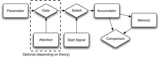 Although specific models have been successful in explaining various aspects of time perception, they often fail when they involve tasks in which time perception is just a part of a larger cognitive context. In the diagram above, the "rest of cognition" is represented by "Memory" and "Comparison". Even worse, general aspects of cognition like Attention are modeled using specific elements in the time estimation model, for example the "Attention" and "Gate components in the diagram. It is therefore a much better idea to view time perception as a component of a larger cognitive architecture, and let the architecture handle the more cognition-general aspects like attention and learning.