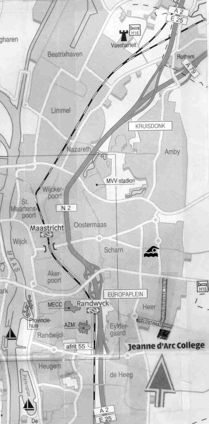 ROUTEBESCHRIJVING NAAR JEANNE D'ARC COLLEGE MAASTRICHTMET HET OPENBAAR VERVOER - met de treintaxi vanaf Maastricht Centraal - met de trein naar Maastricht Centraal Station en verder de stadsbus: Het busperron ligt naast spoor 1, uitgang richting centrum. Alle bussen vertrekken vanaf busperron C. Vertrektijden: